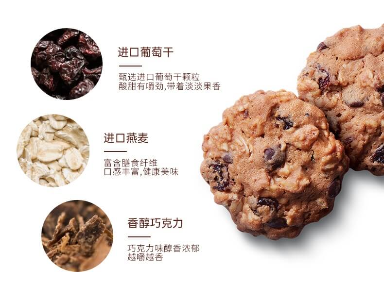 这款香港曲奇饼干选用进口葡萄干、巧克力,搭配富含膳食纤维的燕麦焗制而成。