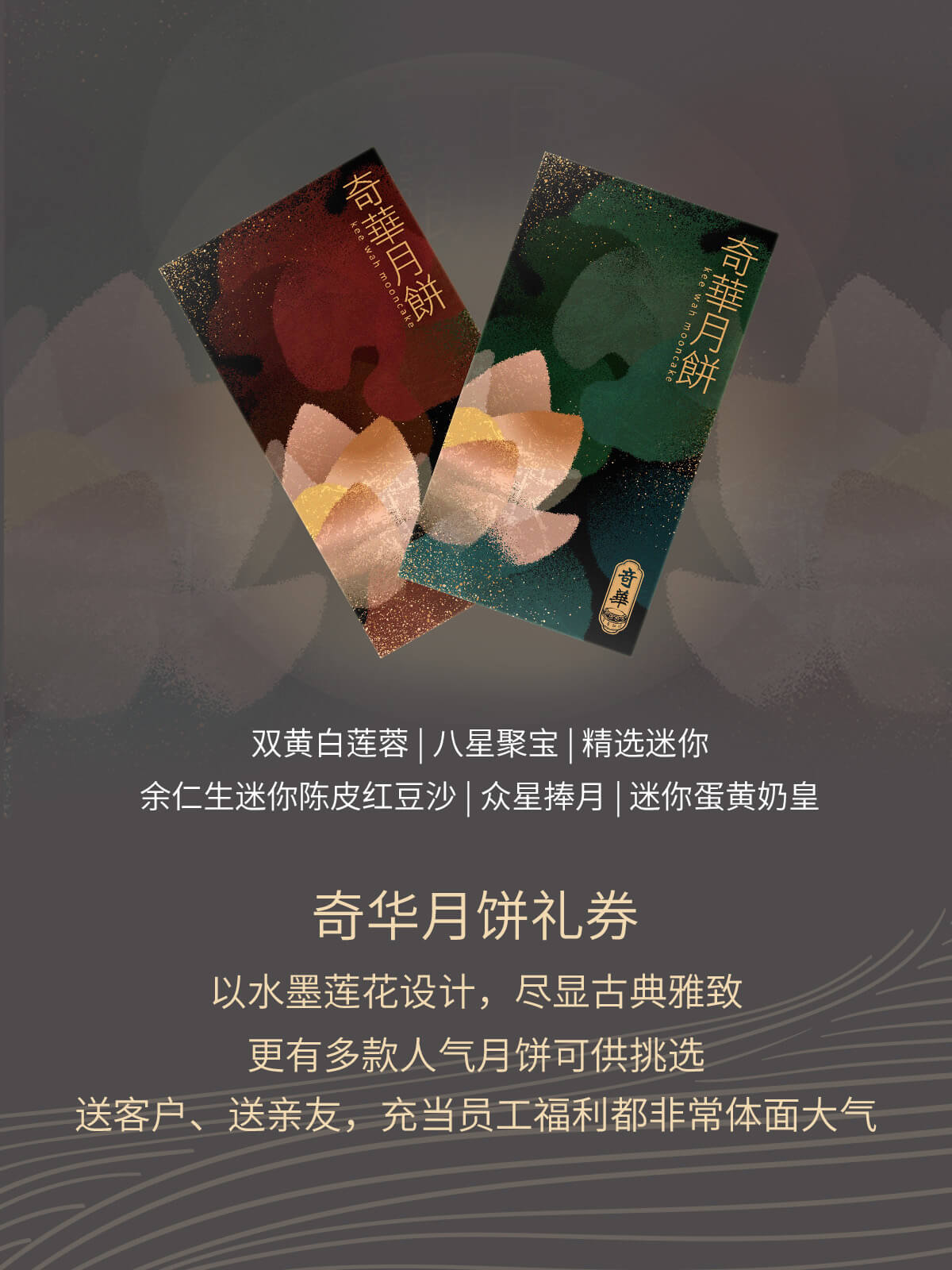 今年奇华月饼礼券,以水墨绘制莲花,淡雅的色泽尽显古典雅致。而且还有多款人气月饼:双黄白莲蓉、八星聚宝 、精选迷你、余仁生迷你陈皮红豆沙、众星捧月、迷你蛋黄奶皇等不同月饼礼盒可供选择,让您送客户、送亲友,充当员工福利都非常体面大气。