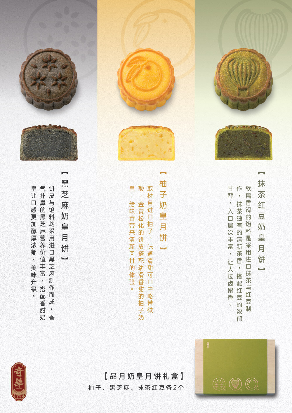 当黑芝麻、柚子、抹茶 与奶皇月饼相撞,焦香芝麻、酸甜果味、清新茶香入馅,充满新意的奶皇月饼,香浓甜蜜,现在在奇华饼家,就可以买到啦!