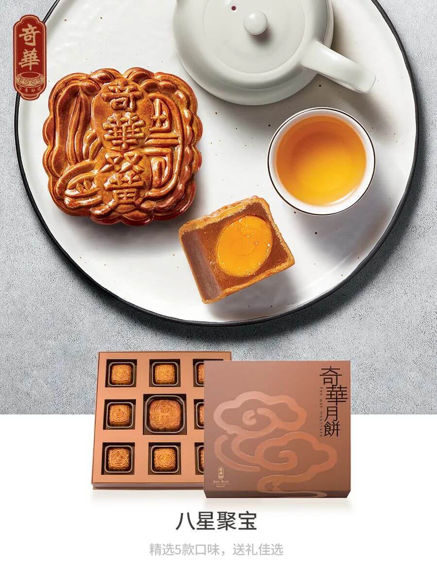 而奇华八星聚宝礼盒,无论在外包装,或是月饼口味上,都绝对能满足你这方面的送礼需求。