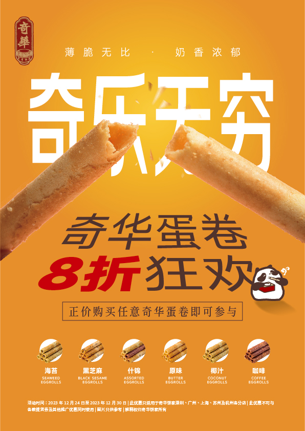 奇华“奇乐无穷,奇华蛋卷8折狂欢”活动,一年只有一次的大促,千万别错过!在岁末的冬日,让奇华香港蛋卷陪你一起,写下这一年的甜蜜句点,用味蕾感受那份只有在狂欢中才能找到的,唯美的奇乐之感!