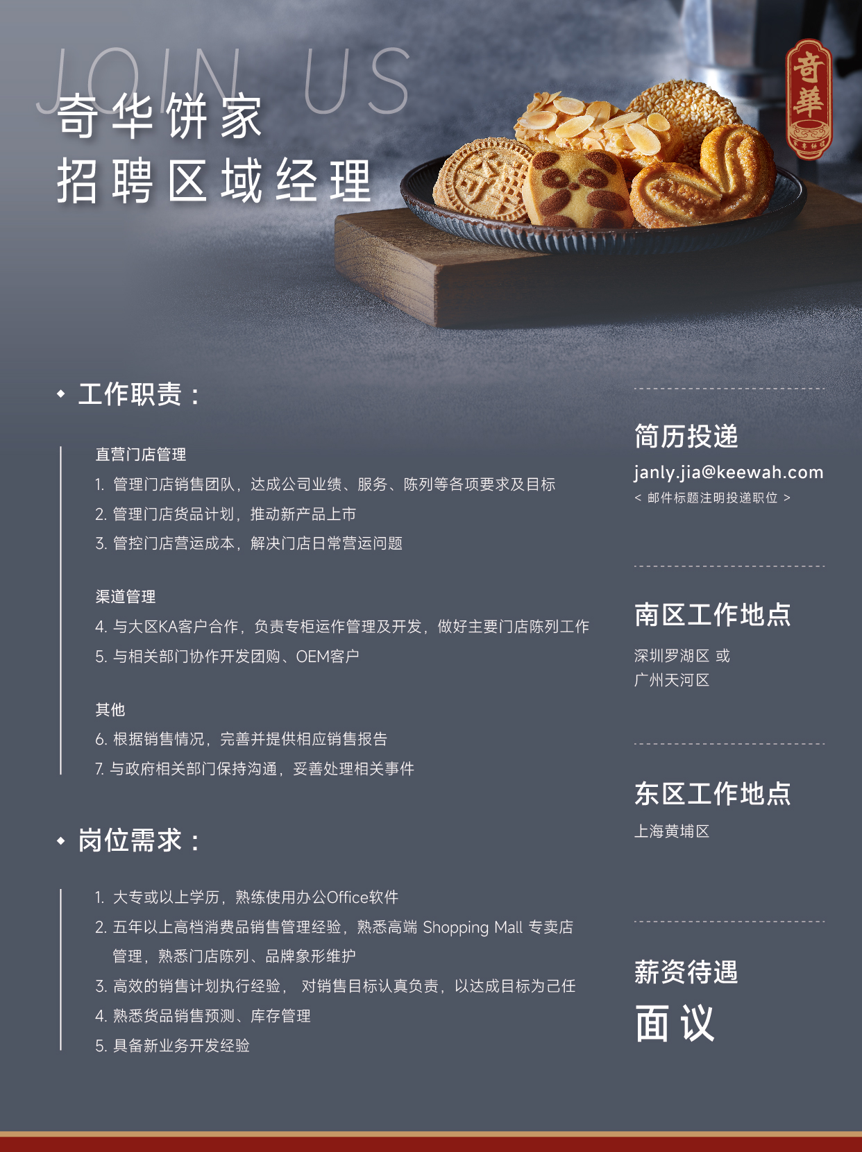 如有兴趣,欢迎投递》》区域经理 – 香港奇华饼家