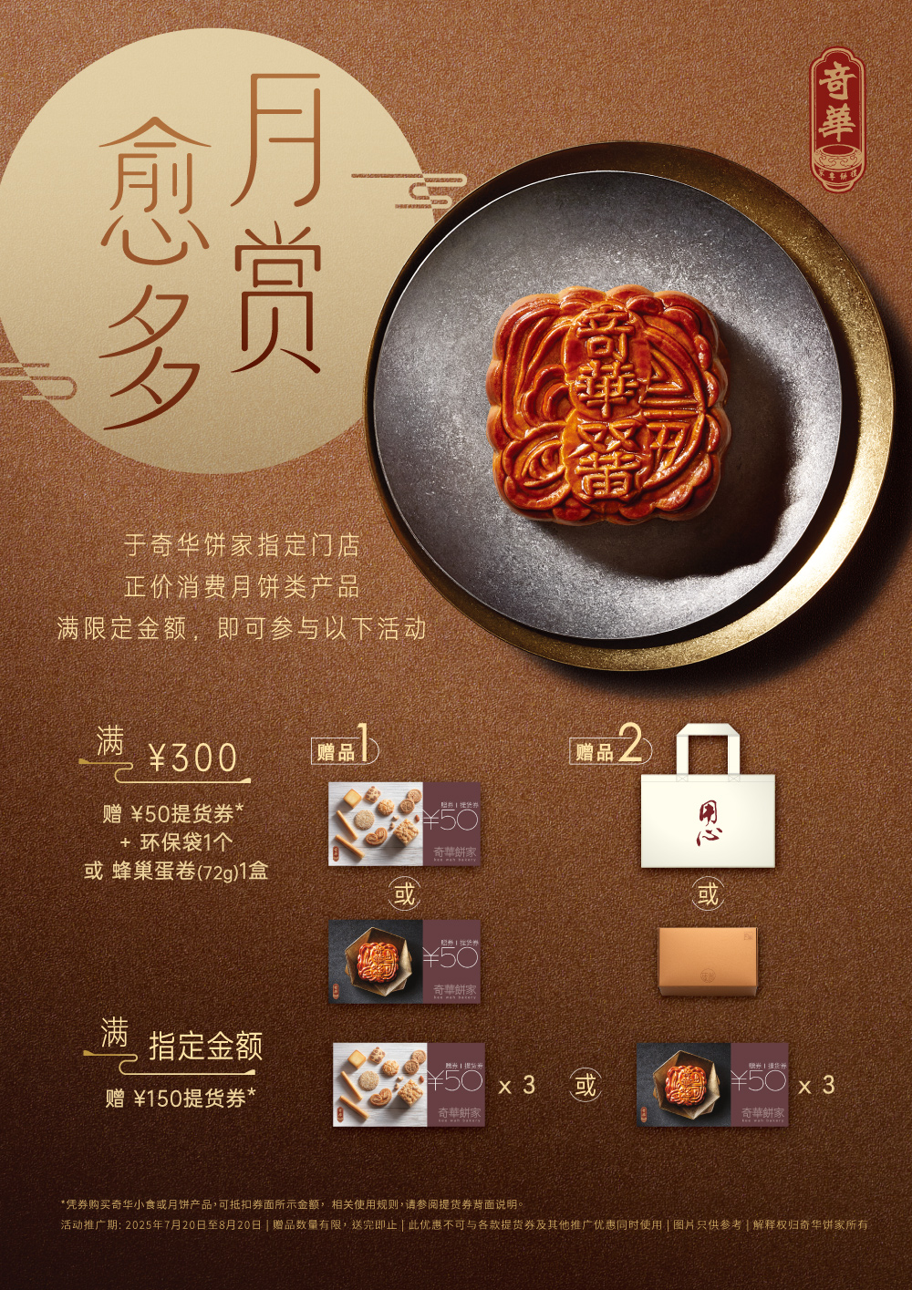 活动截至8月20日,莅临奇华门店选购月饼类产品,即可享受满额赠礼的丰厚回馈。满300元,即可获赠50元提货券一张,以及环保袋或蜂巢蛋卷72g一盒;消费满指定金额,更可获赠150元提货券,让您在享受美味的同时,还能收获满满的惊喜。
